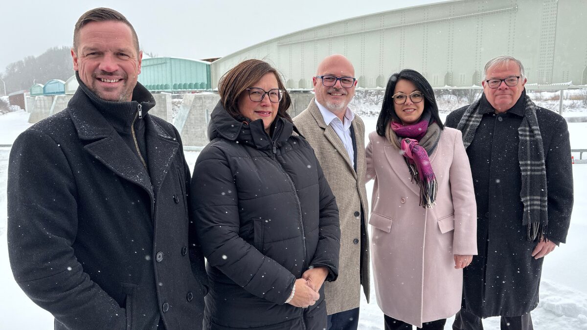 Le ministre Jonatan Julien (au centre) est entouré du maire de Saint-Lambert-de-Lauzon et préfet de la MRC Nouvelle-Beauce, Olivier Dumais, de la députée de Lotbinière-Frontenac, Isabelle Lecours, de la mairesse de Vallée-Jonction, Marie-Ève Roy, et du député de Beauce-Nord, Luc Provençal. | Photo: Benjamin Aubert - Arsenal Media